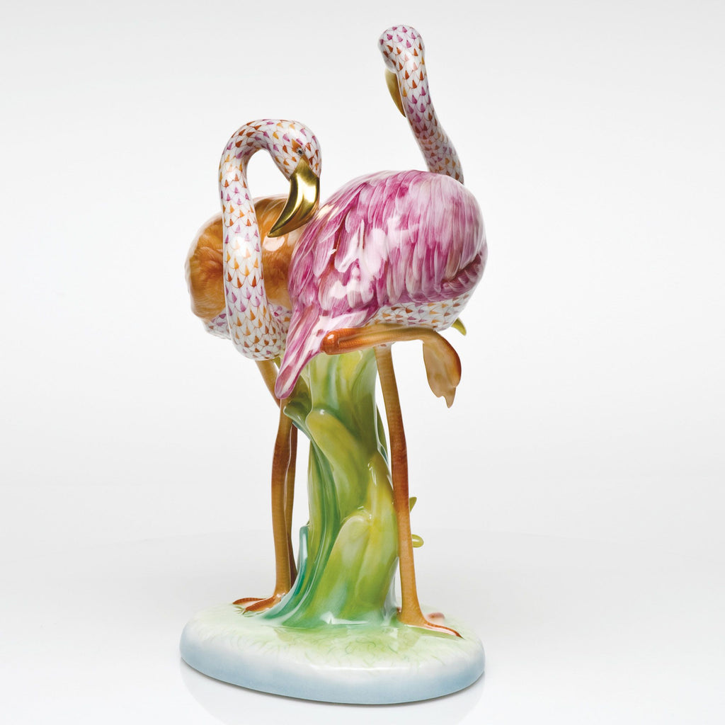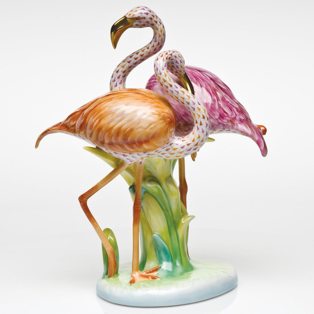 While it may not be the flamenco, Herend's Flamingo Duet presents 2 flamingos in a dance of their own creation. It also features the world-wide debut of a new symphony of fishnet colors in light orange, raspberry and rust. While flamingos don t eat carrots, it is the beta carotene found in their food supply that imparts them with such beautiful pigmentation. Ranging from light pink to bright red, the more colorful the flamingo, the more attractive he is to the opposite sex. It is also this brilliant display of color that gave rise to the name since flamingo has its origins in the French/ Provencal "flamenc" meaning "fire-bird."