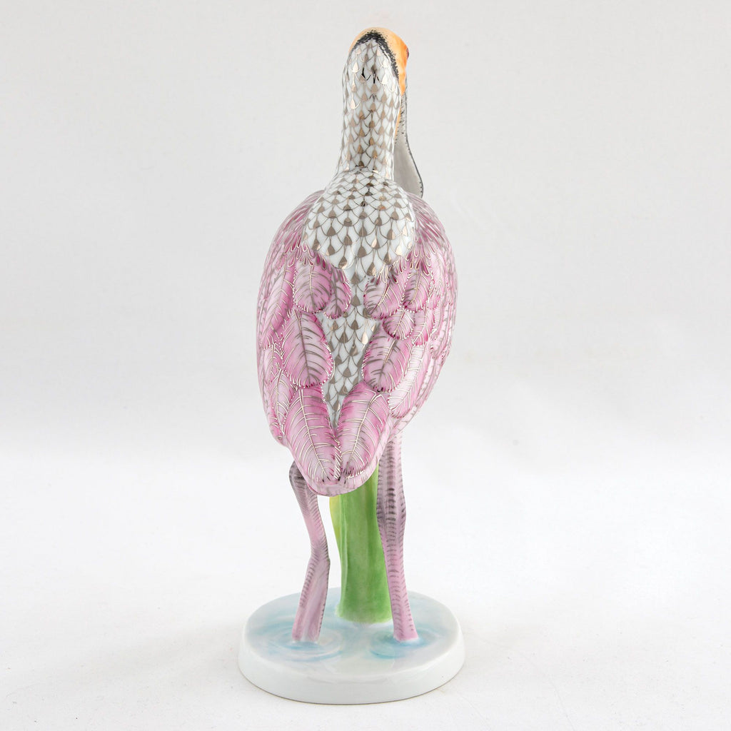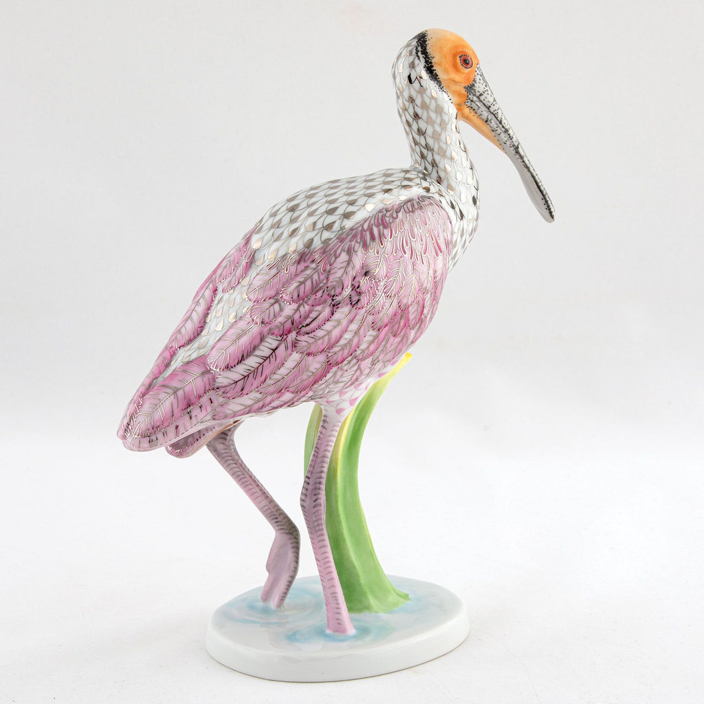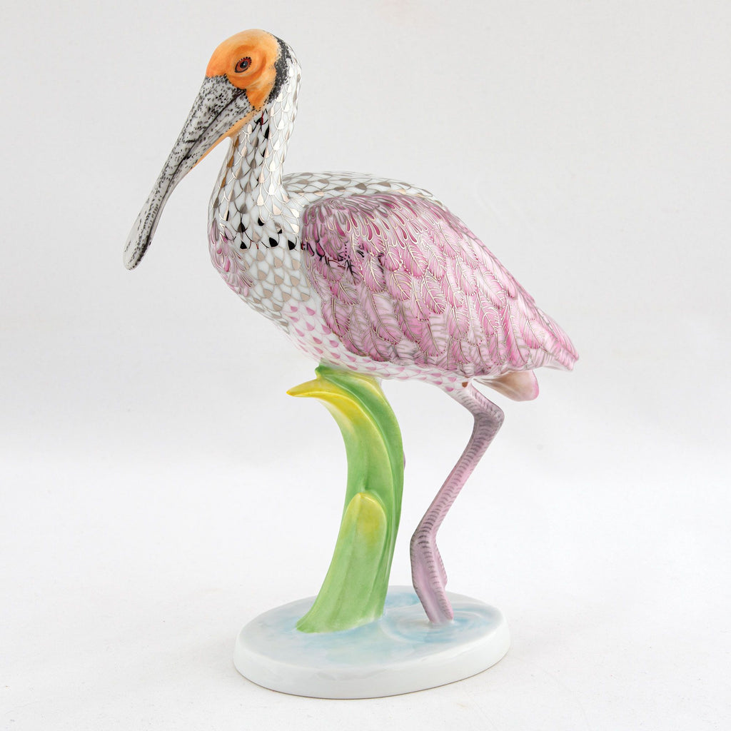 Did their flamboyant, gregarious nature come first or did their vibrant pink feathers? Either way, roseate spoonbills are known equally for their colorful, unusual appearance (that large spoon-shaped bill) and their very social behavior. The artists at Herend have adhered to a faithful rendition but have naturally added distinctive Herend touches with a sparkling platinum fishnet pattern combined with meticulous details on the feathers to draw deliberate attention to this defining part of the spoonbill.