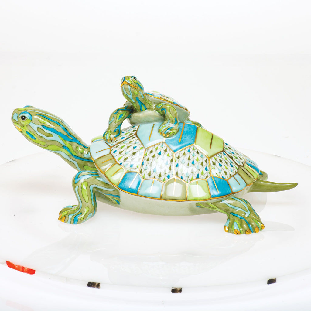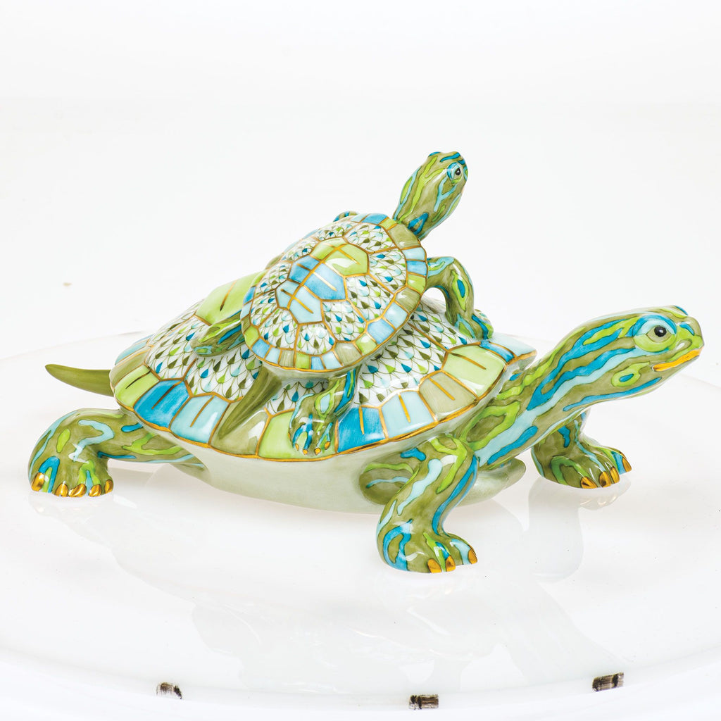 A turtle pyramid is the best way to reach up for those critical UV rays and to soak up some essential heat. In this case, the sun is also shining a spotlight on this lounging duo's arresting mix of Herend's classic fishnet pattern combined with vivid streaks of color. The result is a dramatic variation on the turtles' usual camouflage painted to reflect the colors found in the diverse layers of the pond they like to call home.