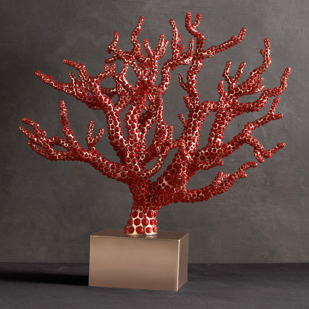 As unique and varied as the brilliant red corals found in the Mediterranean sea, Coral is a fascinating piece of modern design. Each piece is sculpted by hand by a master artisan, plated in 24K gold, and features over 8,000+ hand-set red coral cabochons.
