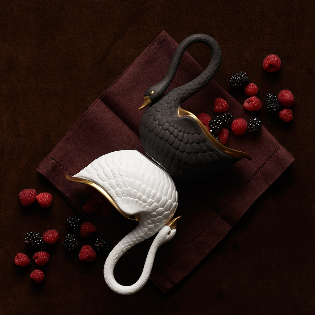 Inspired by the highly sculptural and beautifully detailed porcelain of the 19th century Empire period, the Swan bowls proudly nod to antiquity with unmistakable modern grace. From the luminescent, hand-gilded 24K gold of the bowl to the silky feathers on the curve of the neck, each piece is a singular and exquisite work of art, sculpted and finished entirely by hand. Available in white and black.