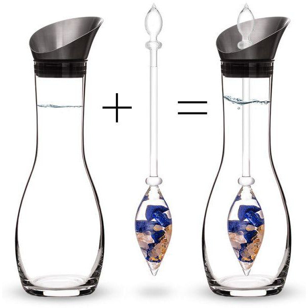 Change the world with your creativity and break fresh ground! Get inspired by enjoying a glass of crystal water from this enchanting combination of rutilated quartz and the deep, celestial blue lapis lazuli – a symbol for spirituality in ancient Egypt about 6,000 years ago. The beautiful, golden-streaked rutile is said to energize and to improve awareness. Your brain is made up of about 75% liquid. Research has revealed that drinking water when we feel thirsty boosts our brain's performance. Feed your brainpower every day with this very special blend of crystal elixir.