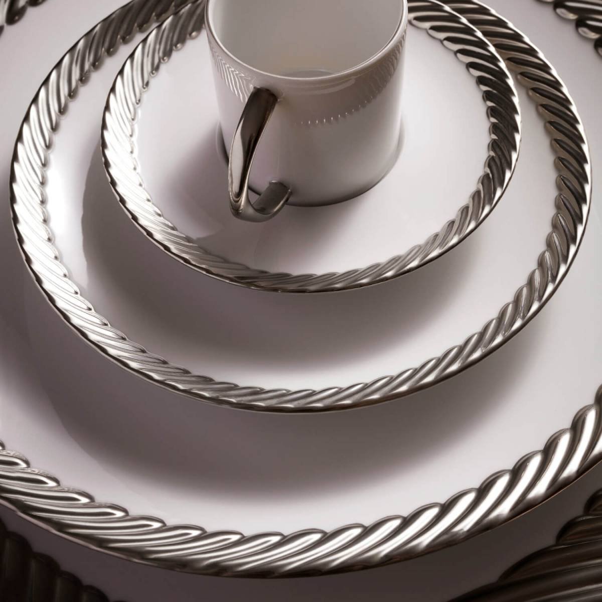 Soie Tressée, French for "Silk Braid," is a modern expression of a timeless classic and offers a contemporary look on an ancient shape. Made of Limoges porcelain, this dinnerware collection is available in white or with the braids beautifully accentuated in hand-gilded 24K gold and platinum.
