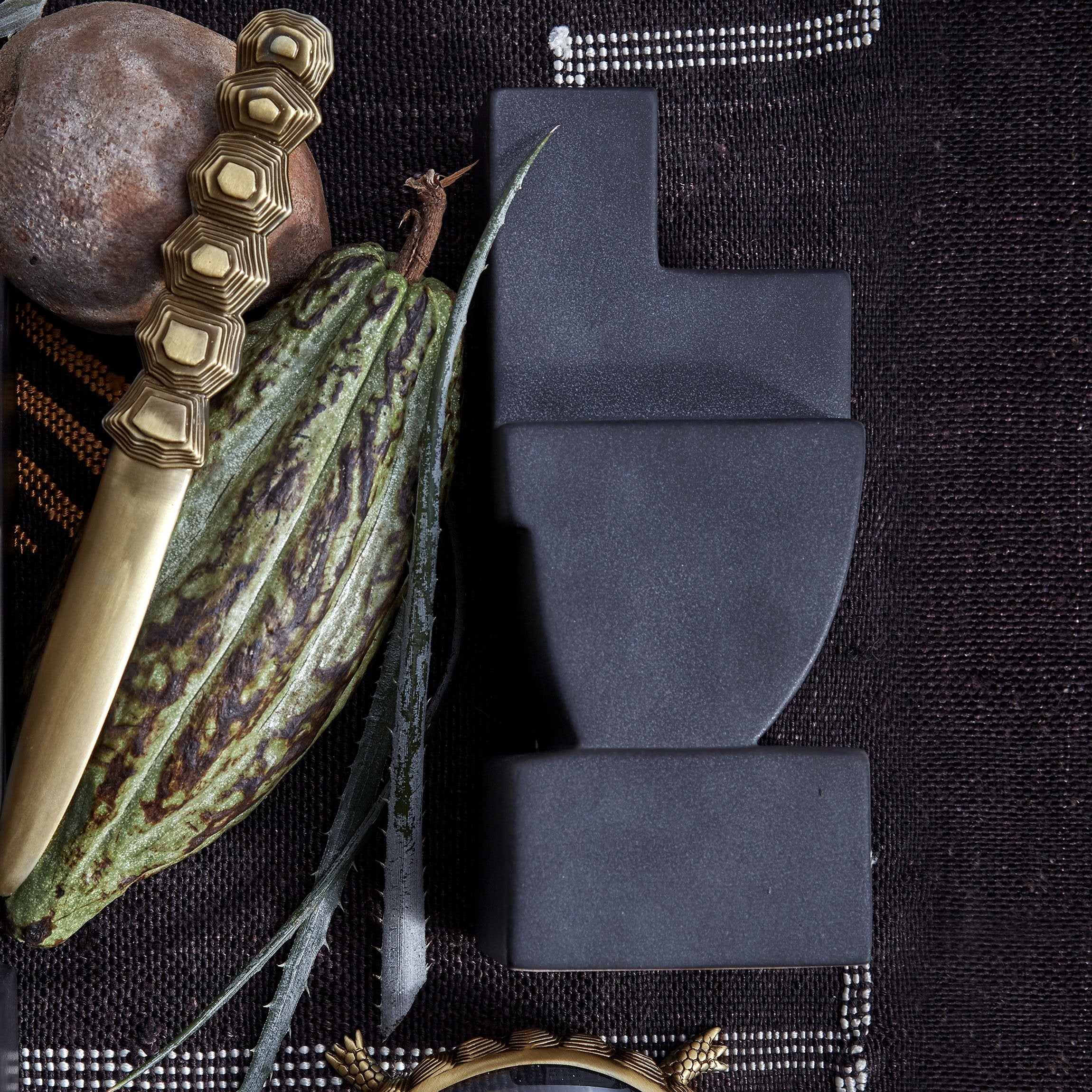 With a nod to both cubist art and Mayan carving, Cubisme takes geometric simplicity to a new level. Bookends are created from lightly textured earthenware and feature antiqued gold accents.