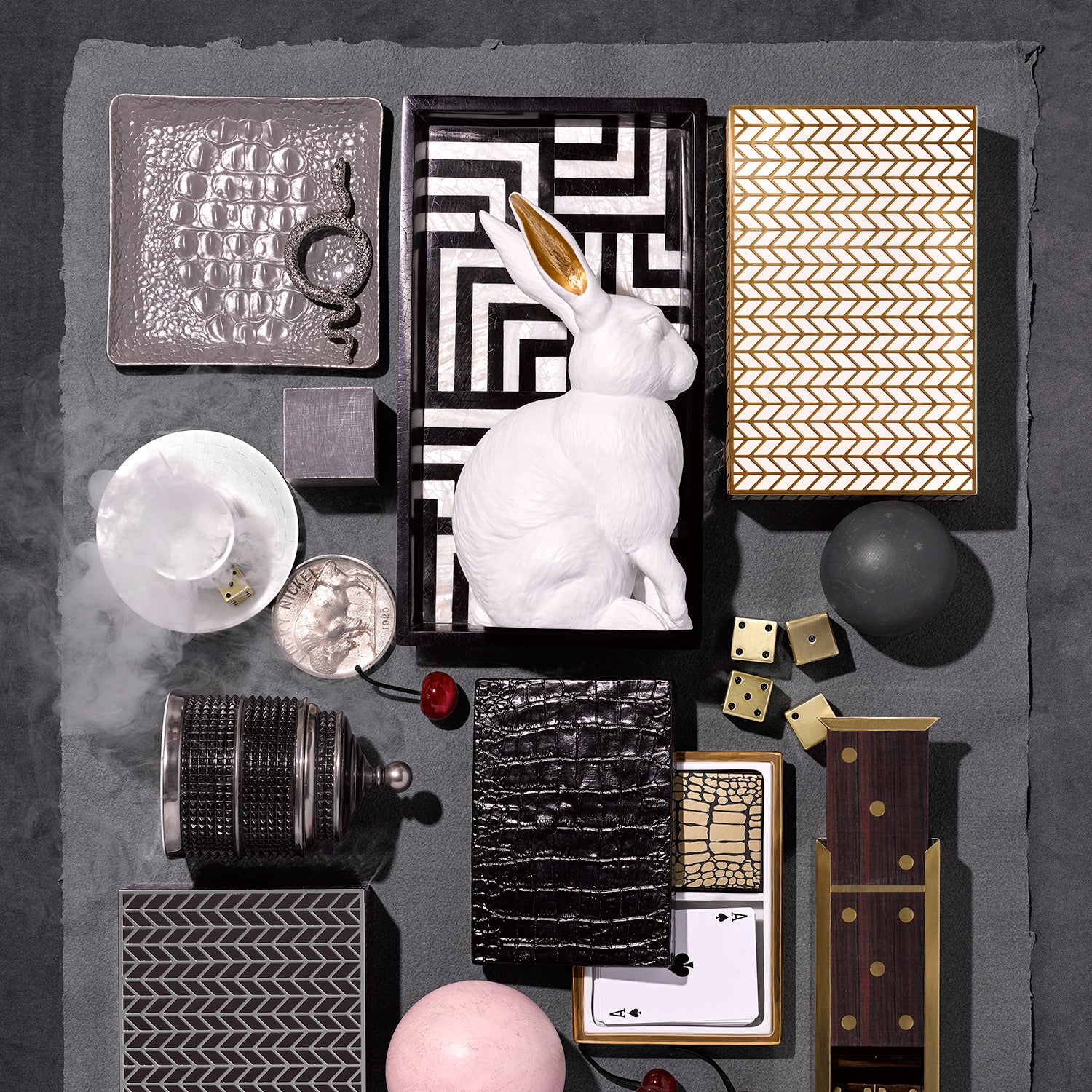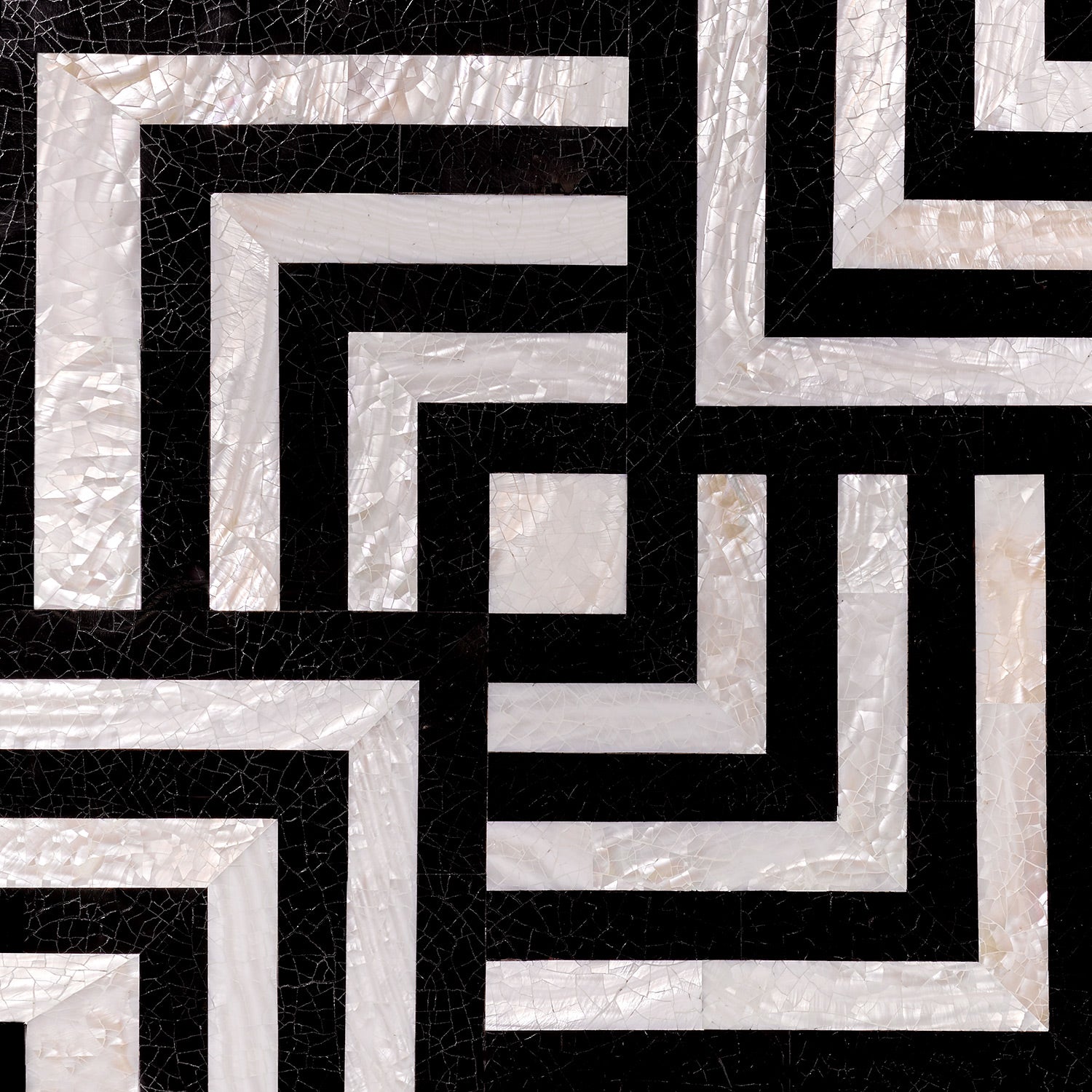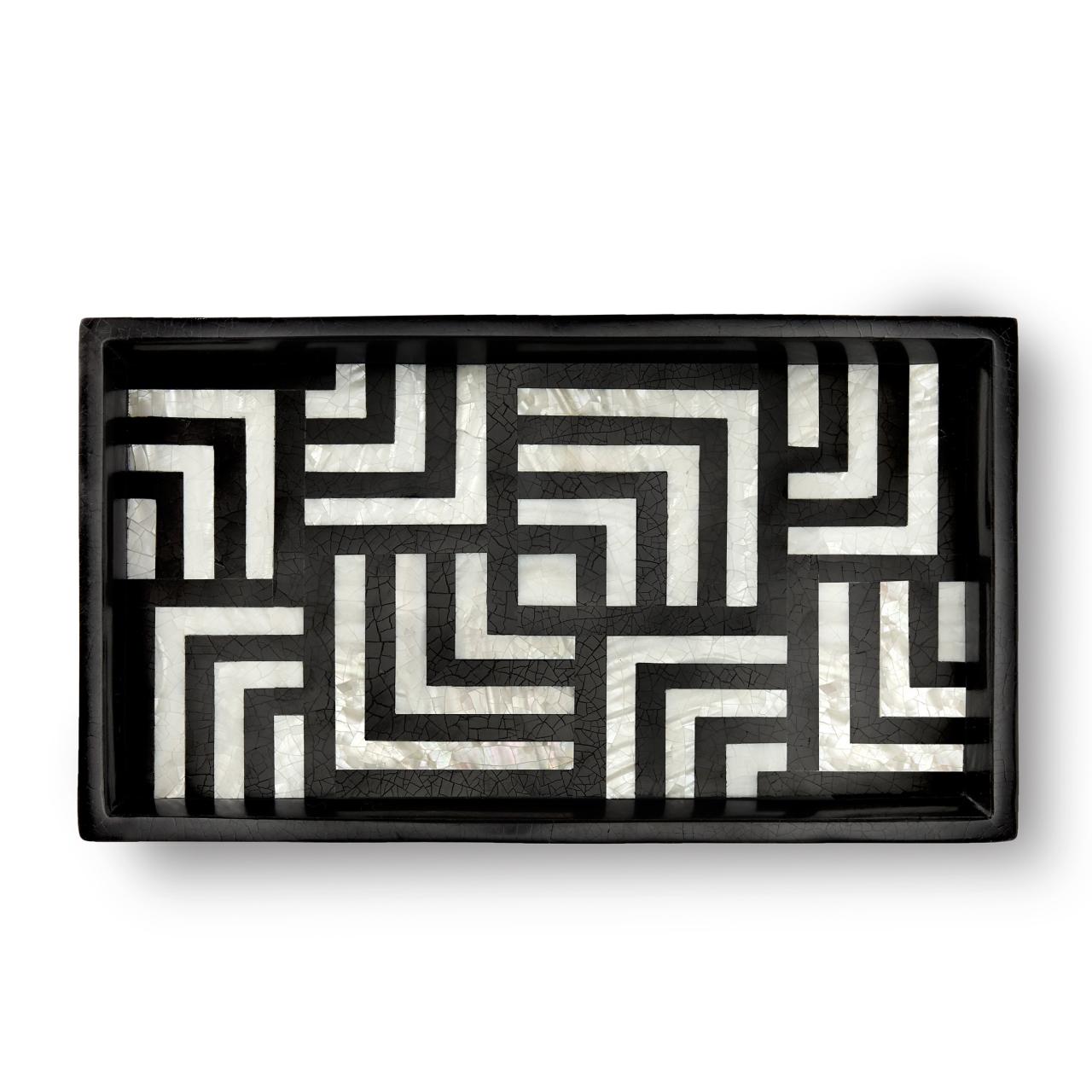 With mesmerizing geometric patterns and graceful styling, our trays are modern, smart and sophisticated. Be hypnotized by the bold, seemingly shifting shapes created from Black, White, and Grey natural shells. Beautifully handcrafted, the larger trays feature brass detailed handles.