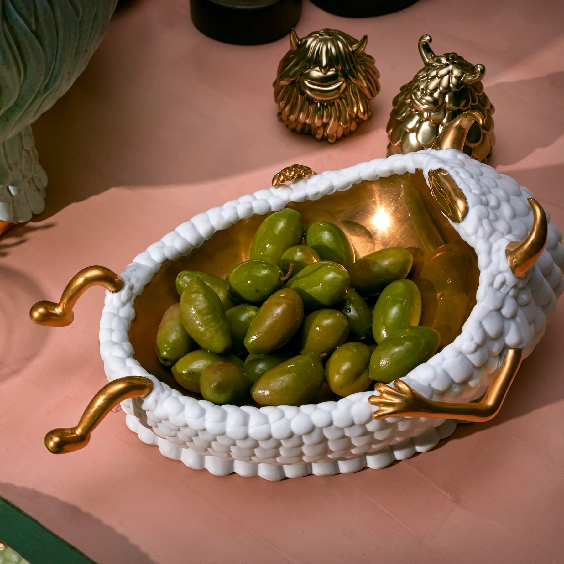 The L’OBJET Haas Brothers collection is a meeting of imaginative minds and skilled hands. Inspired by the otherworldly landscape of Joshua Tree, Los Angeles-based artists Simon and Nikolai Haas worked in close collaboration with the master craftsmen at L’OBJET to create a collection that spans tableware, home décor, textiles and fragrance. Together, they have brought to life a family of characterful creatures with the highest quality of finish and function. These are objects to be cherished. In using them, everyday moments become memorable; the ordinary becomes extraordinary. Lynda is an exquisitely decorated yet secretive creature who likes to hide treasure in her belly. She rewards anyone brave enough to come close to discover the surprise of what she keeps within. Designed to create an unforgettable serving ceremony. Available in black or white porcelain.