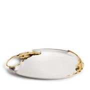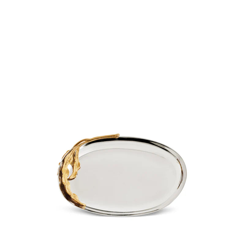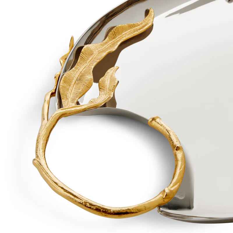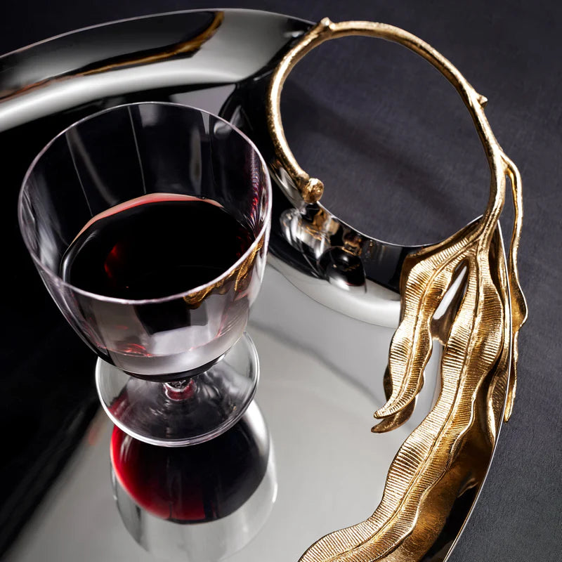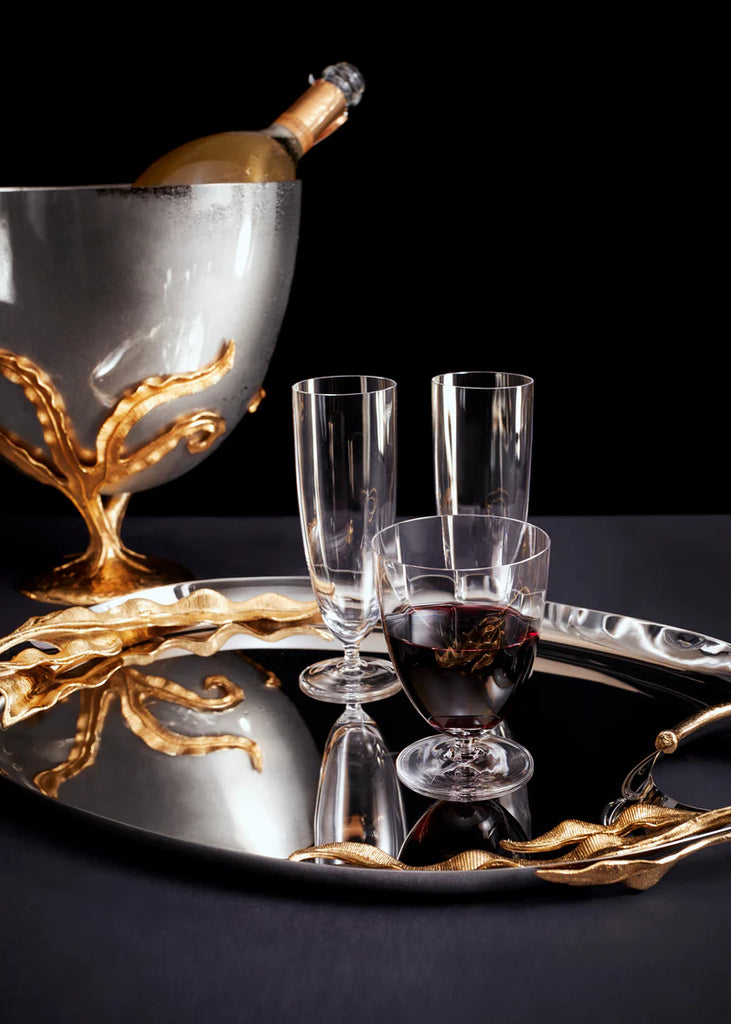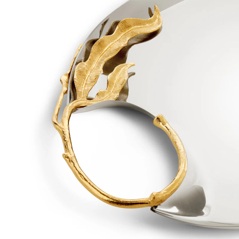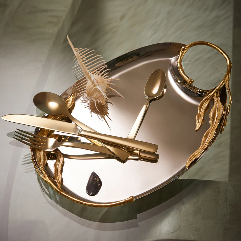 An ensemble of eight pieces that embodies elegance and craftsmanship. Each piece, meticulously crafted from stainless steel and adorned with 24k gold-plated accents, features a dynamic hand-sculpted fern motif showcasing the unparalleled talent of our master craftsmen. Including three sizes of trays, two sizes of big bowls, a champagne bucket, a pitcher, and two sizes of small bowls, the Fern Collection merges durability with opulent sophistication, transforming any dining experience into a celebration of refined luxury.